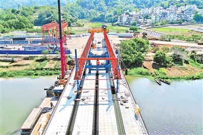 3月12日,春光明媚。记者来到郁南县南江口镇河塱村,只见南江河上,架桥机、大型吊车不停运转,工人们正加紧进行路基施工、护栏安装和桥面附属工程建设,一座崭新的大桥雏形已现。