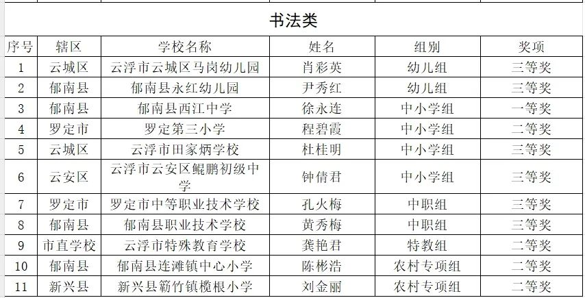 在粤东粤西粤北地区中小学合唱交流展示活动中,我市参加小学组、初中组和高中组的比赛,获得一等奖2个、二等奖3个、三等奖13个。云浮市教育局获优秀组织奖。获奖的学校分别是: