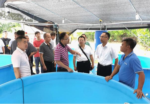 (图为调研组在肇庆市四会市国斌水产养殖专业合作社考察圆桶养殖情况)