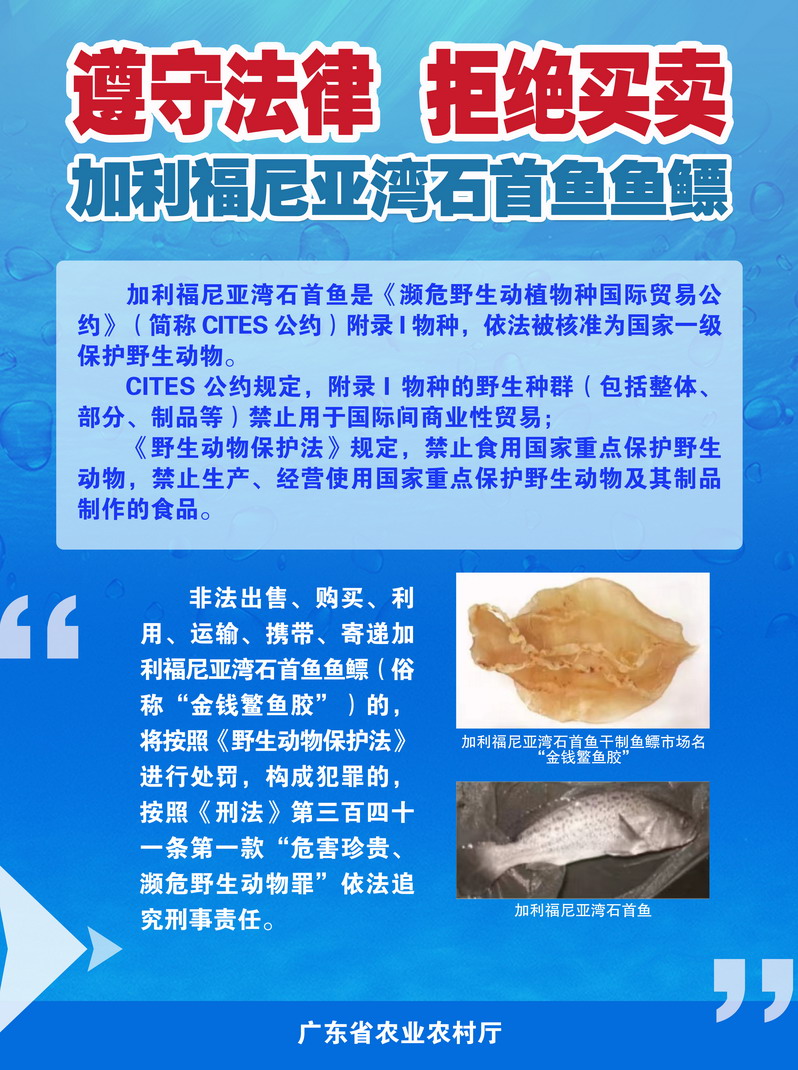 为进一步做好对加州石首鱼的保护宣传工作,请大家不断提高对保护加州石首鱼的认识,共同抵制非法消费加州石首鱼鱼鳔,合力开展保护加州石首鱼、打击石首鱼鱼鳔非法贸易的宣传或教育活动。