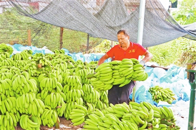 本报讯 (通讯员 张健珍)  近日,郁南县平台镇妙门村的田间地头,一串串饱满的香蕉压弯了翠绿的蕉叶,在阳光下泛着诱人的光泽,农户们手持镰刀穿梭于蕉林间。