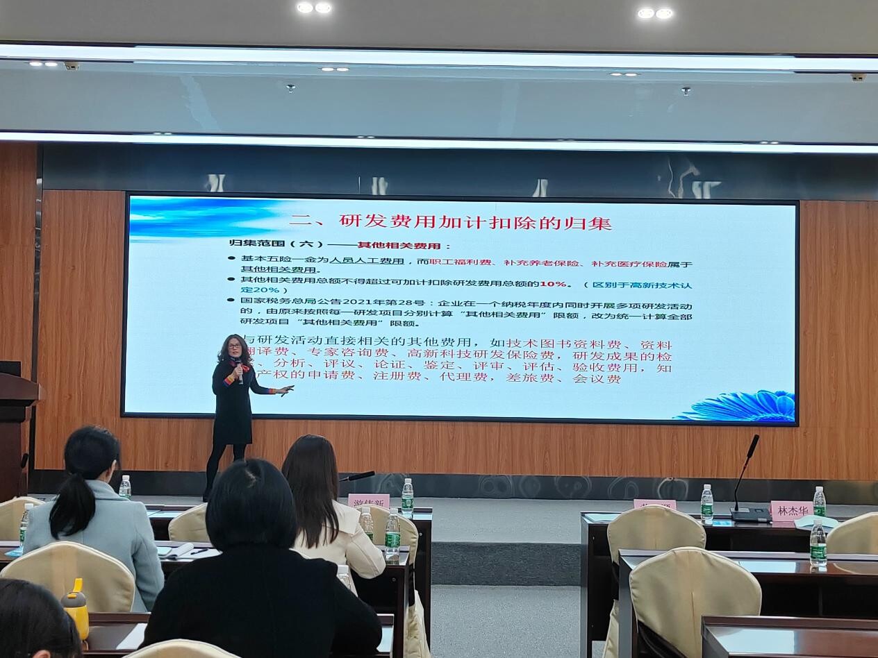 培训班上,魏大姣老师围绕科技项目立项及项目经费管理、研发费用加计扣除政策解读、R&D费用核算规则等方面业务知识进行了详细讲解,指导参训人员进一步掌握政策要点,把R&D投入作为提高企业自主创新能力、贯彻落实国家科技创新政策精神的有效途径,做到科学纳统、应统尽统。培训现场,参训人员积极互动交流,魏大姣老师逐一对提出的问题进行了答疑解惑。