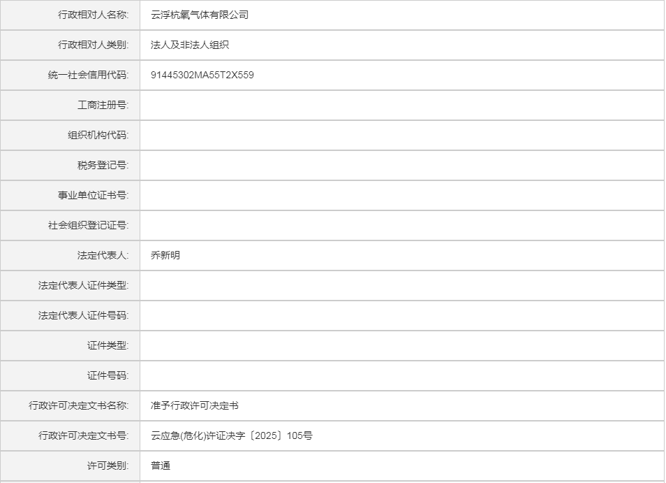 云应急(危化)许证决字〔2025〕105号云浮杭氧气体有限公司危险化学品安全生产许可证(新领证)