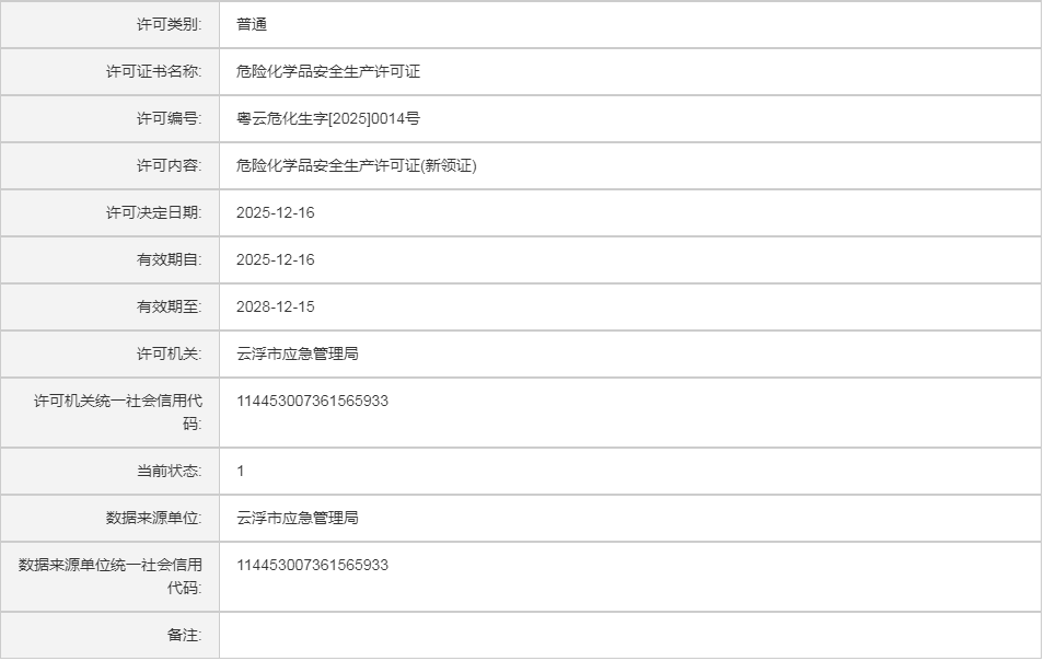 云应急(危化)许证决字〔2026〕2号云浮市鑫隆汇环保新材料有限公司危险化学品安全生产许可证(延期换证)