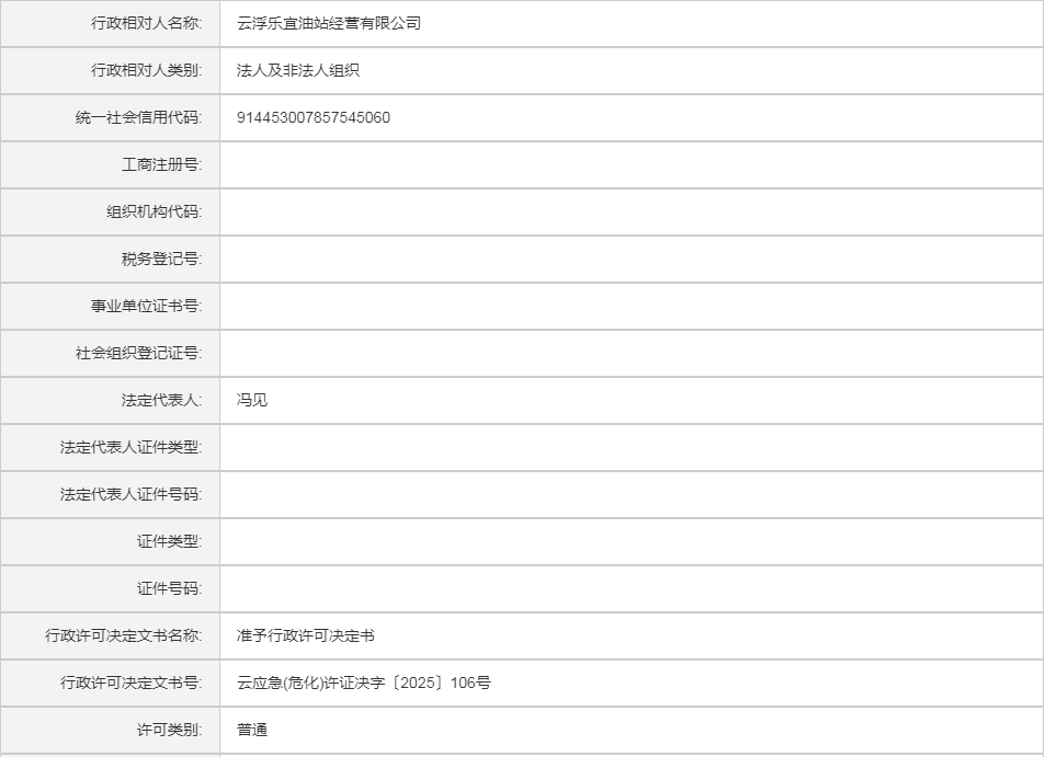 云应急(危化)许证决字〔2025〕106号云浮乐宜油站经营有限公司危险化学品经营许可证(变更换证)