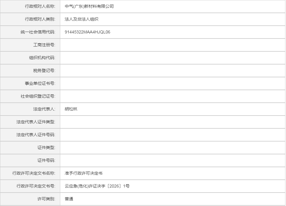 云应急(危化)许证决字〔2026〕1号中气(广东)新材料有限公司危险化学品建设项目安全设条件审查意见书