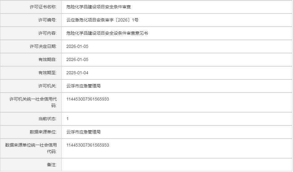 云应急(危化)许证决字〔2026〕2号云浮市鑫隆汇环保新材料有限公司危险化学品安全生产许可证(延期换证)