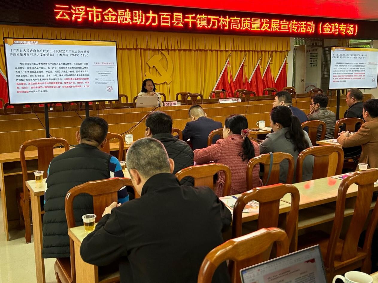 为贯彻落实市委、市政府实施“百县千镇万村高质量发展工程”有关工作部署,市金融工作局近日牵头组织开展金融政策镇域宣讲活动,在全市范围内选取特色镇街进行金融政策知识宣讲。活动的第一站于3月28日在罗定市金鸡镇举行,由市金融工作局副局长黄丹丹带队,会同辖内部分金融机构、政府性融资担保机构开展宣讲活动,金鸡镇政府、各村委、驻镇帮扶有关人员,镇内部分企业、农户和个体工商户等共50多人参加了活动。